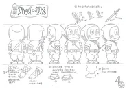 Hattori's permanent outfit is a set of blue ninja robes, which consist of an outer blue hoodie shirt with a v-neck and folded sleeves and yellow cross shaped full sleeves inner underneath, blue pajama pants, a red ribbon as his belt and a pair of Japanese cultural sandals. He also always wears a steel sword on his back with white ribbon on the front. He has spirals on his cheeks. However, in some episodes, he changes his clothes for special occasions.